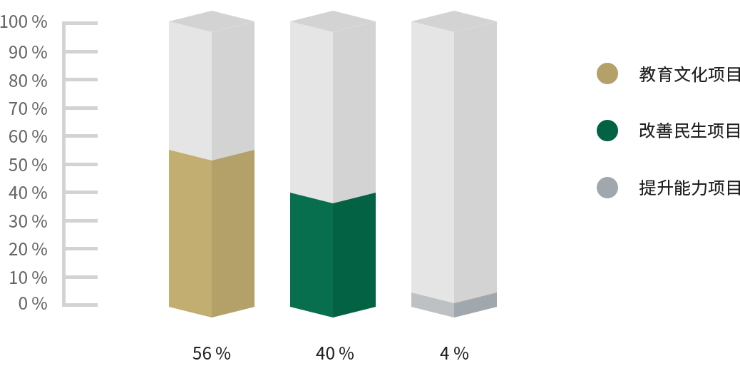 截止2017年12月,基金会共捐款3.46亿元人民币,其中56%支持教育文化项目,40%支持改善民生项目,4%支持提升能力项目。2018年新增捐赠975万元,这些项目带来了积极的社会影响。